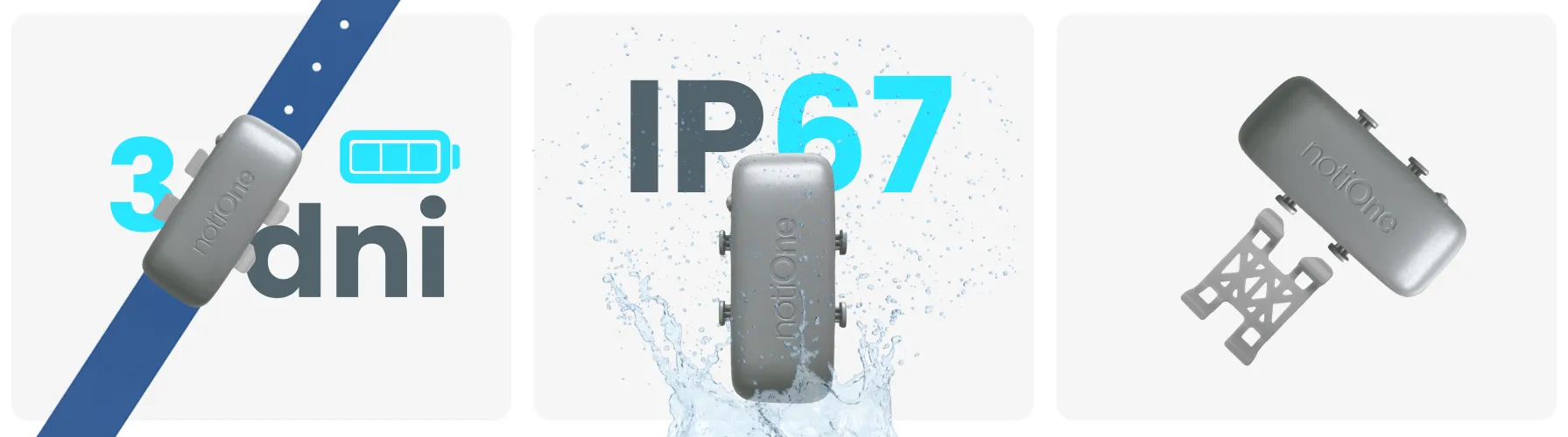 notiOne GPS pet jest wodoodporny (klasa IP67) i odporny na wstrząsy. Sprawdzi się podczas każdej pogody i w każdych warunkach terenowych.