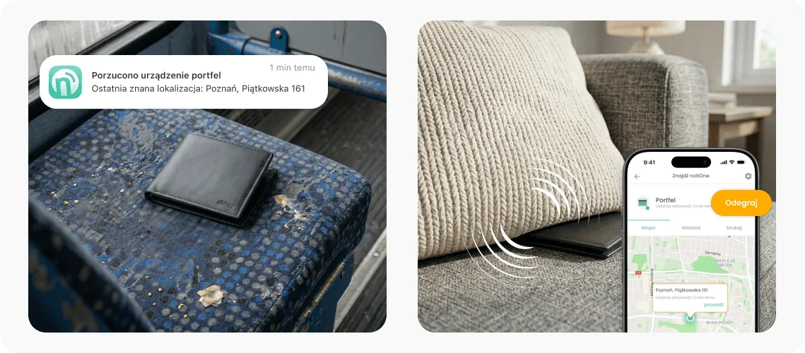 Jeśli nie masz portfela przy sobie, aplikacja notiOne pokaże jego ostatnią znaną lokalizację. To szczególnie pomocne, gdy próbujesz odtworzyć moment zgubienia. Gdy zgubisz portfel z dokumentami, taka informacja pomaga szybciej zawęzić obszar poszukiwań a sama aplikacja pokieruje Cię do wskazanego miejsca.